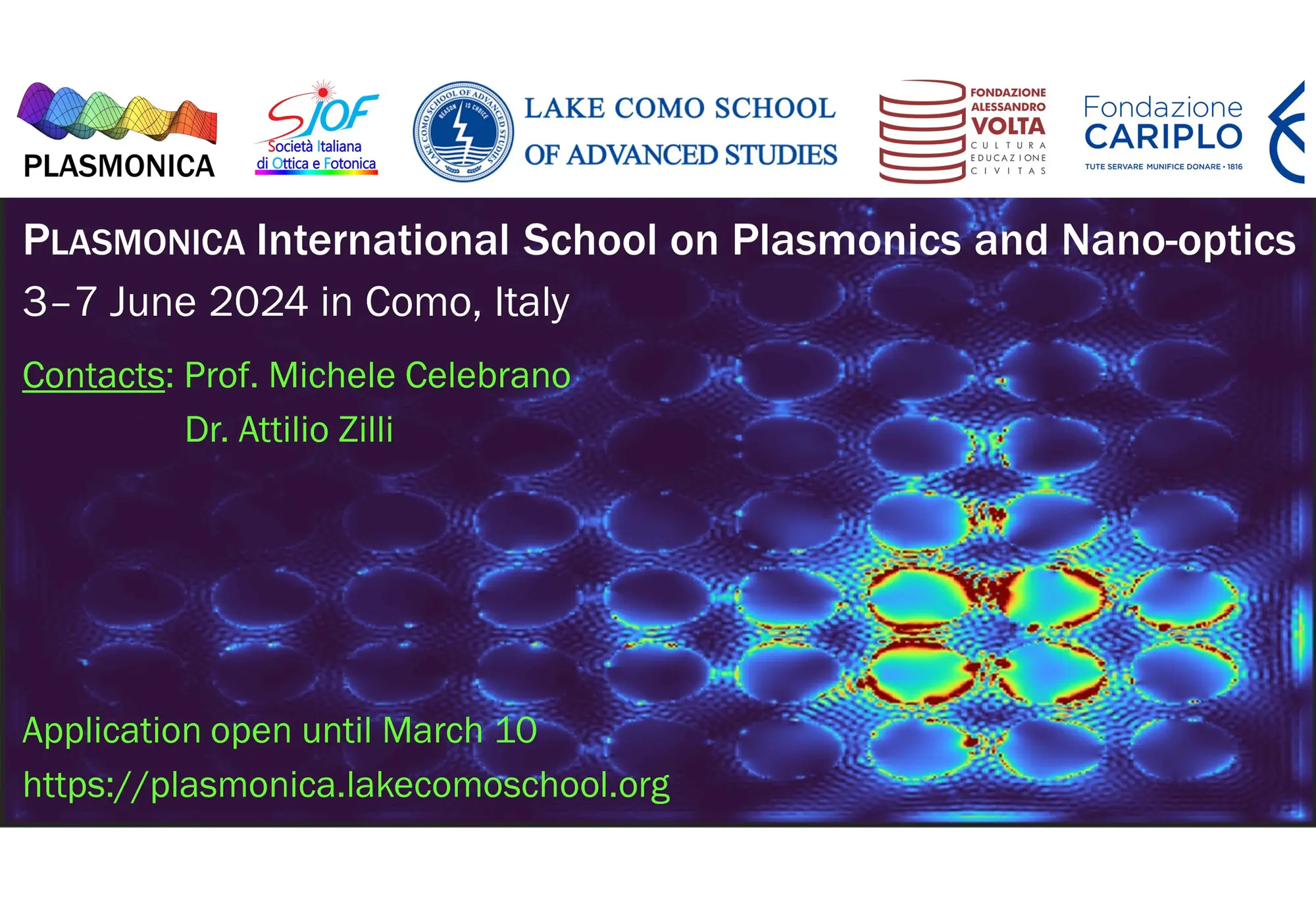 The Plasmonica community – constituted as the “Plasmonics and Nano-Optics” working group of the Italian Optical Society (SIOF) – is pleased to announce the 4thedition of the International School on Plasmonics and Nano-optics, which will be held on June 3–7, 2024 in Como, Italy. The event is co-sponsored and hosted by the Lake Como School of Advanced Studies in the stunning setting of the Villa del Grumello, overlooking lake Como. The School will feature four short courses from globally renowned academics (Javier Aizpurua, Laura Lechuga, Lukas Novotny, Maxim Shcherbakov) introducing the attendees to relevant topics in nano-optics, both fundamental and applied. The lectures will be complemented with seminars by the lecturers themselves and by renowned Italian researchers (Cristian Manzoni, Marco Liscidini, Monica Bollani and Tiziana Cesca) covering the latest developments in the field. The interaction between lecturers and students will be fostered through several tasks of active learning.