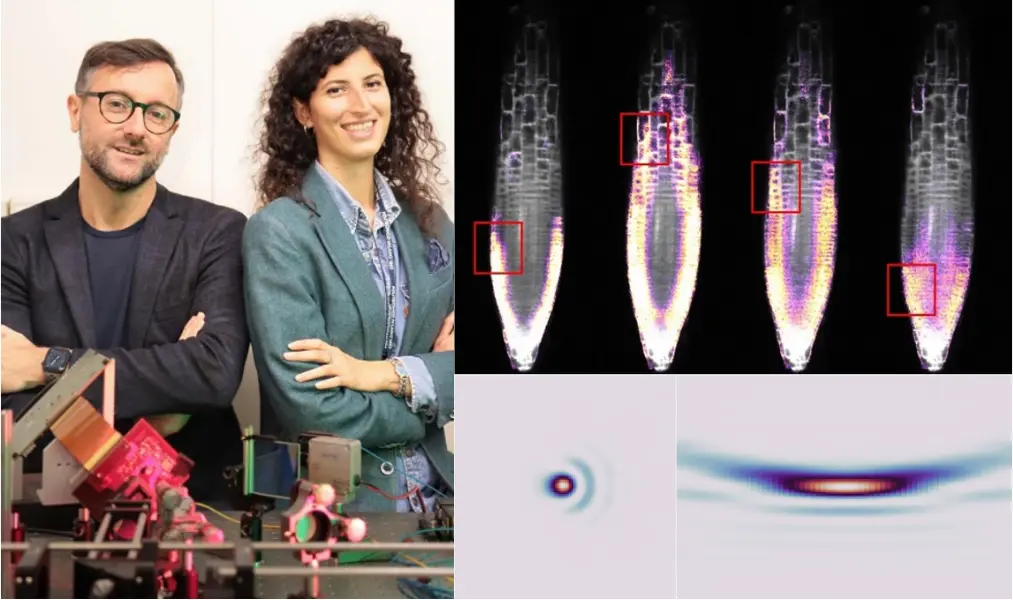 ** Nell'imagine in alto a destra: Propagazione di un segnale di calcio nella radice di una pianta, osservata con microscopia a fluorescenza.