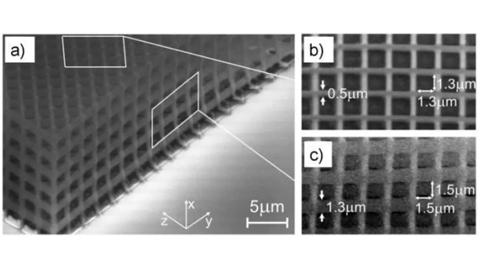 The laser source used for 2PP fabrication is a frequency-doubled erbium-doped fiber laser (TOPTICA). The laser, working in mode-locking regime, emits pulses of 100 fs with a repetition rate of 100MHz, at a central wavelength of 780 nm a and average power of 150 mW. The laser beam passes through a galvanomagnetic laser shutter (Altechna) and through a telescope for beam expansion. The power can be controlled by an attenuation stage composed by a polarizer and a mechanically controlled waveplate. The sample is mounted on a piezoelectric 3-axes translator with nanometric resolution. The beam is focused inside the sample with a high NA oil immersion objective (Plan-APOCHROMAT 100x 1.4 NA, Carl Zeiss AG). The structures are realized in a hybrid organic-inorganic solgel resist (SZ2080), specifically developed for 2PP. The final devices are visualized with a scanning electron microscope (SEM).