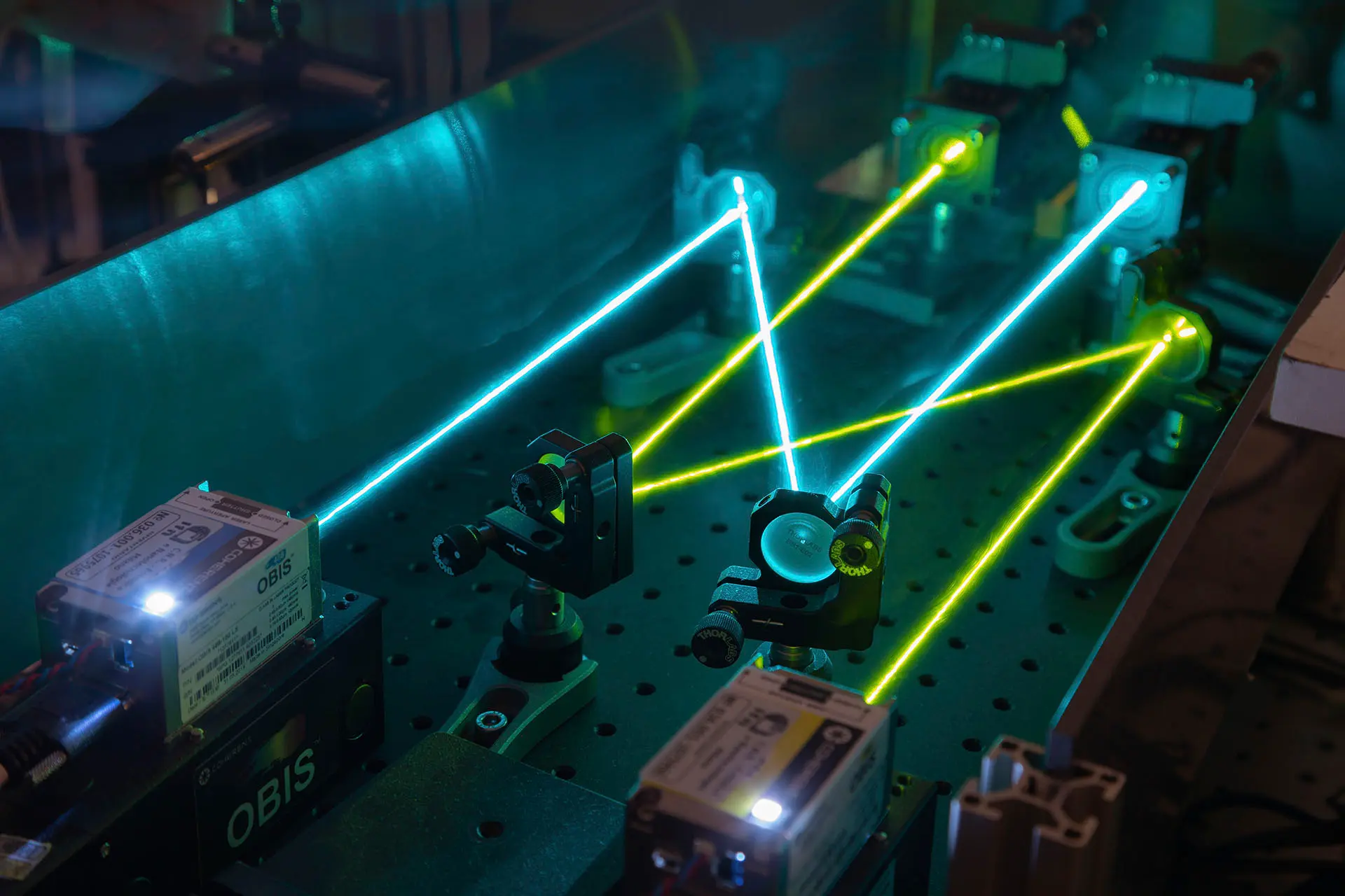 This laboratory is equipped with specific instrumentation for the realization and characterization of microfluidic channels: two pressure-based high-precision pump systems with 4 channels each (FLUIGENT and ELVEFLOW), with a resolution of few µbar; one syringe pump for the direct control of the flux at the input or output of the devices; several sensors for the measurement of microfluidic flux, with a resolution down to 1.5 μl/min. Moreover, a fluorescence microscope, for biological samples analysis, and a bright-field microscope, for channel measurement and characterization, are present.For the characterization and actuation of integrated photonic components, such as optical tweezers or waveguides for detection and illumination, there are several solid-state lasers emitting in visible-lightspectrum and one high-power IR fiber laser with a maximum power of 10 W.