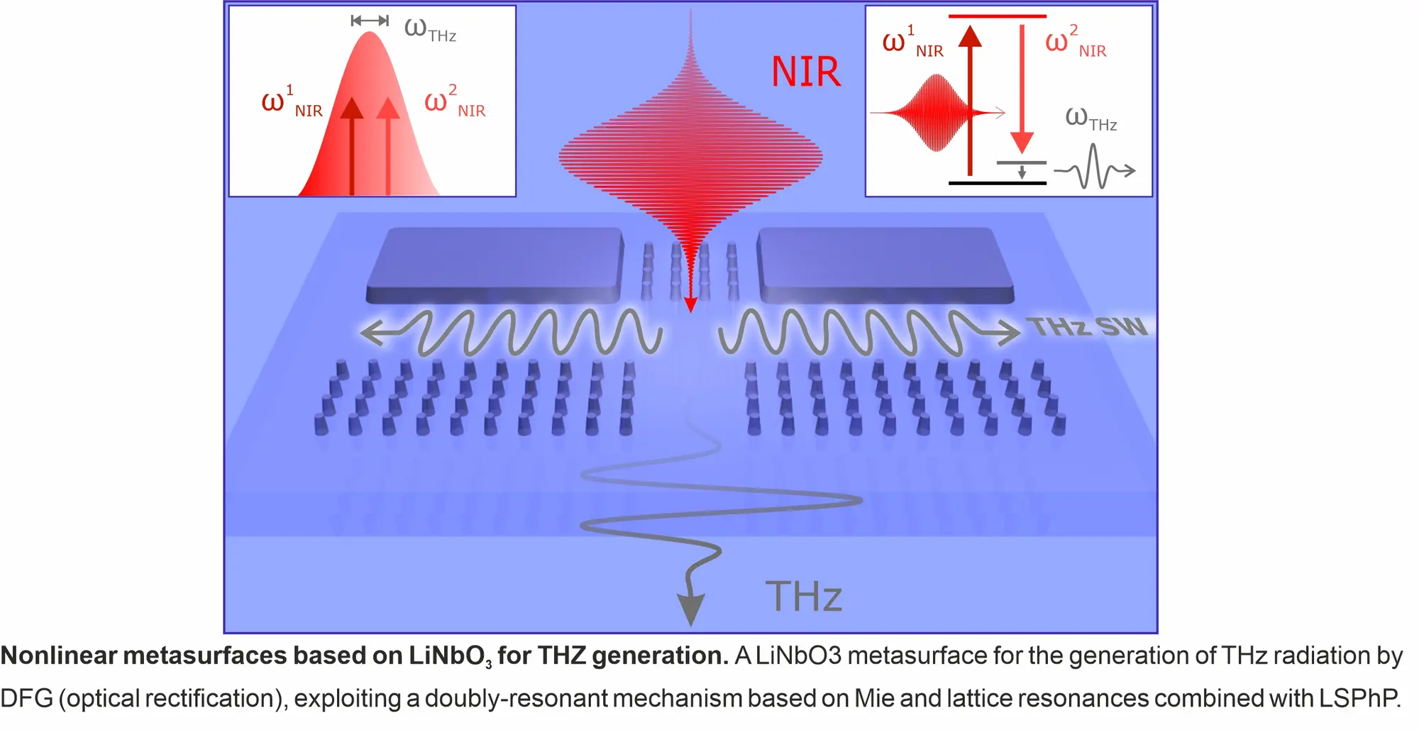 NO LIMITHz proposes a potential breakthrough in this field, by developing a new family of integrated THz broadband sources with unmatched conversion efficiencies and ad-hoc wavefront shaping by means of a disruptive platform based on an innovative artificial nonlinear optical metamaterial. NO LIMITHz is based on very recent results showing that dielectric metasurfaces – two-dimensional metamaterials – enable THz light emission with efficiencies comparable to the best nonlinear optical materials in nature, but in a sub-wavelength thickness. Furthermore, it leverages our demonstrations of functional nonlinear lithium niobate metasurfaces enabling strong enhancement and dynamic control of the nonlinear optical interactions.