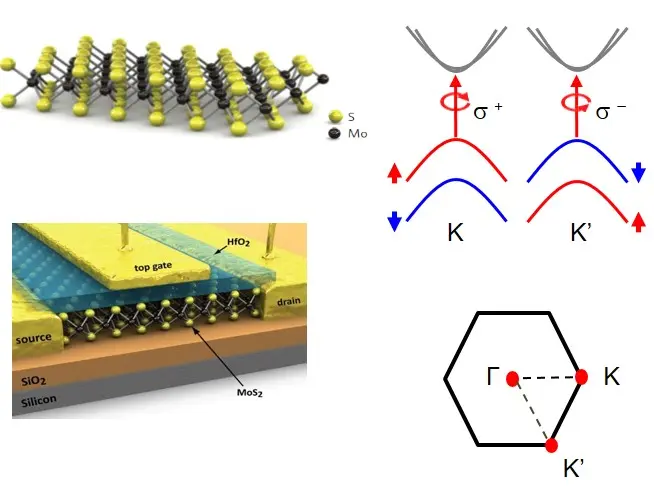 (MoS2, MoSe2, WS2 and WSe2). Contrary to the semimetallic graphene, these TMDs are semiconductors and bear a large potential for a new generation of electronic and optoelectronic devices. They drastically change their band structure from indirect to direct gap upon thinning them to monolayers. The monolayer band structure exhibits two non-equivalent valleys at the K and K’ points at the edge of the Brillouin zone. Strong spin-orbit interaction and inversion symmetry breaking makes the valence and conduction bands spin-polarized at K and K’. Therefore, using circularly polarized light, we can selectively populate one of the valleys with spin-polarized carriers. The possibility to use this degree of freedom for quantum computation has initiated the field of “valleytronics”.