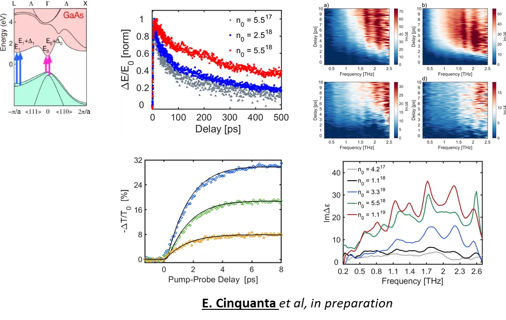 b) Ultrafast Phonon-Assisted Absorption in Semiconductors. When a direct band-gap semiconductor absorbs photons, electrons are promoted to the conduction band. The conductivity of the photoexcited material is often modeled as that of a Drude-like free electron gas. However, if the photon energy is larger than the direct gap and the photon flux is substantial, side valleys of the conduction band are strongly populated; in this case the interaction of the electron gas with lattice vibrations is no longer negligible and leads to a more complex transient conduction behavior. A prototypical case is gallium arsenide, that shows resonances in the THz spectral region related to electron-phonon coupling. The dynamics of this coupling will be studied in the THz domain as a function of the delay from the impulsive optical excitation, in order to enlighten the nature of this electron-phonon coupling and its evolution during intervalley electron scattering.