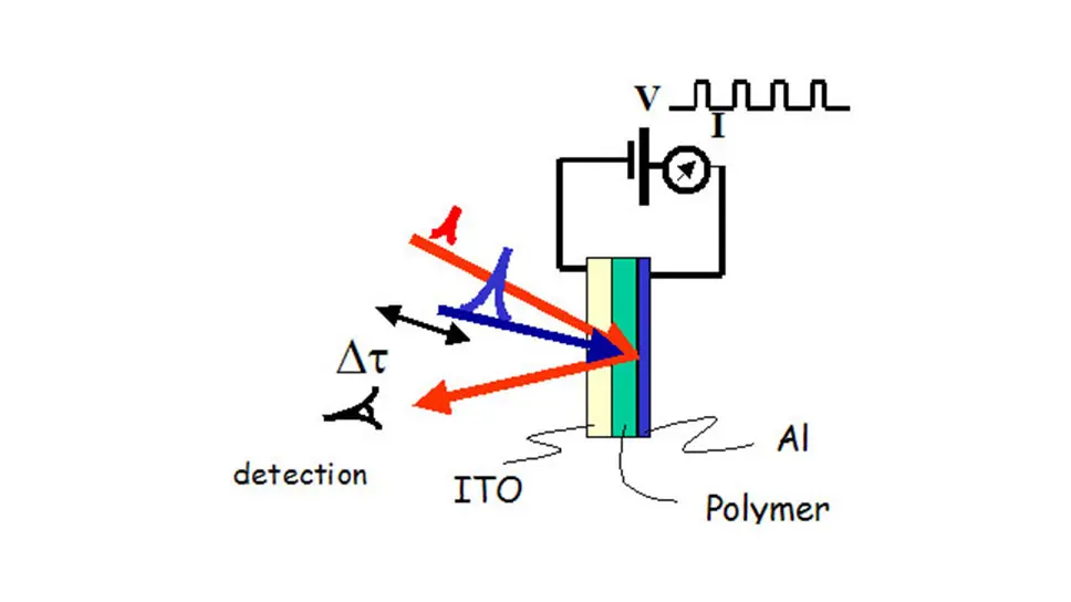 L’apparato di spettroscopia risolta in tempo assistita da un campo elettrico modulato permette lo studio dei processi fondamentali, quali generazione di cariche e ricombinazione delle stesse, in dispositivi elettroluminescenti. Il dispositivo posto in vuoto consiste di uno strato di ITO, ossido di stagno ed indio, trasparente al visibile, uno strato del materiale attivo, ed un catodo di alluminio. Gli impulsi laser di pompa e di probe (sovrapposti spazialmente e temporalmente sul campione) vengono ritardati l’uno rispetto all’altro. Entrambi i fasci attraversano il campione e vengono riflessi dallo strato di alluminio; solo il fascio di probe riflesso viene però raccolto. Il campo elettrico applicato al dispositivo è modulato ed è dell’ordine di pochi MV/cm. Con questa tecnica si possono misurare piccole variazioni della trasmissione del fascio di probe attraverso il campione in presenza del fascio di pompa, ma indotte dal campo elettrico applicato.
