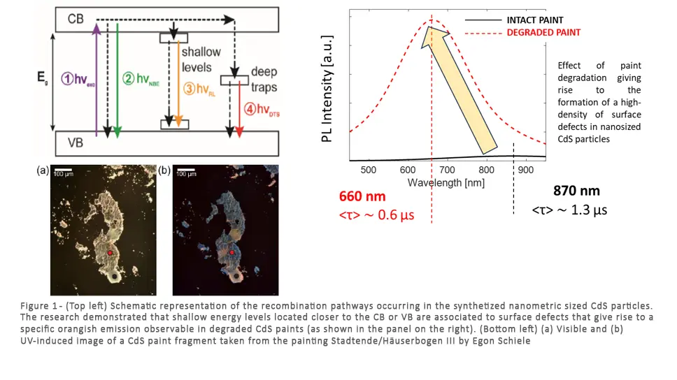 The high surface-to-volume ratio of the synthetized pigment particles results in a high density of defects that promotes CdS surface reactivity and the subsequent deterioration of CdS-based paints. The research further demonstrated that these surface defects are associated with shallow energy levels located closer to the CdS CB or VB, which give rise to a specific orangish PL emission observable in degraded CdS paints (Figure 1).