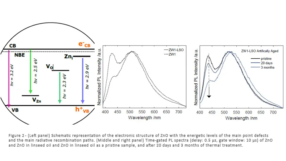 The research, aimed to understand the physical processes behind the interaction of ZnO with an oil binding medium, has allowed us to characterize the optical recombination paths associated to specific crystalline defects. We demonstrated that the density of specific point defects (interstitial zinc) is related to the semiconductor tendency to photodegrade the adsorbed organic molecules, such as carboxylic acids, affecting the pigment's role in paint failures (Figure 2).