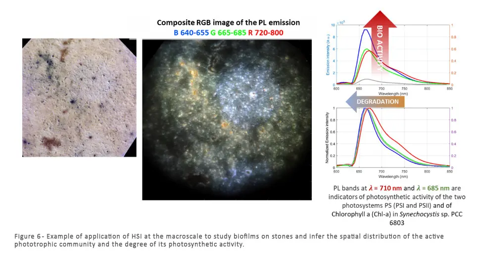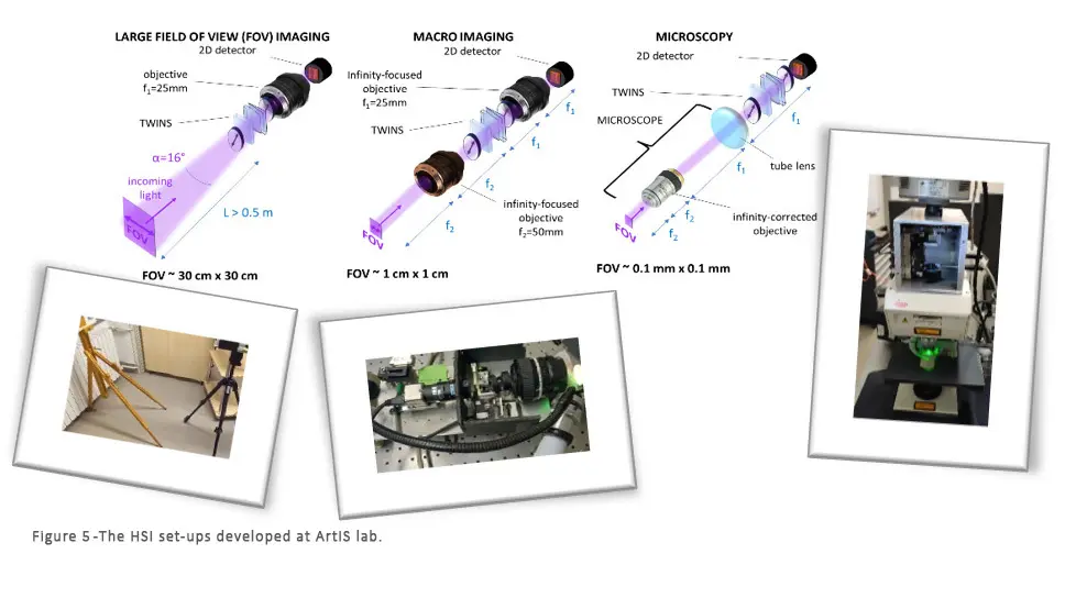 - Hyperspectral imaging (HSI) at variable spatial scales: the HSI camera, based on the patented TWINS interferometer, is coupled to properly designed optical system (Figure 5) to study the photophysical properties of samples with a multiscale and multimodal approach (Figure 6)