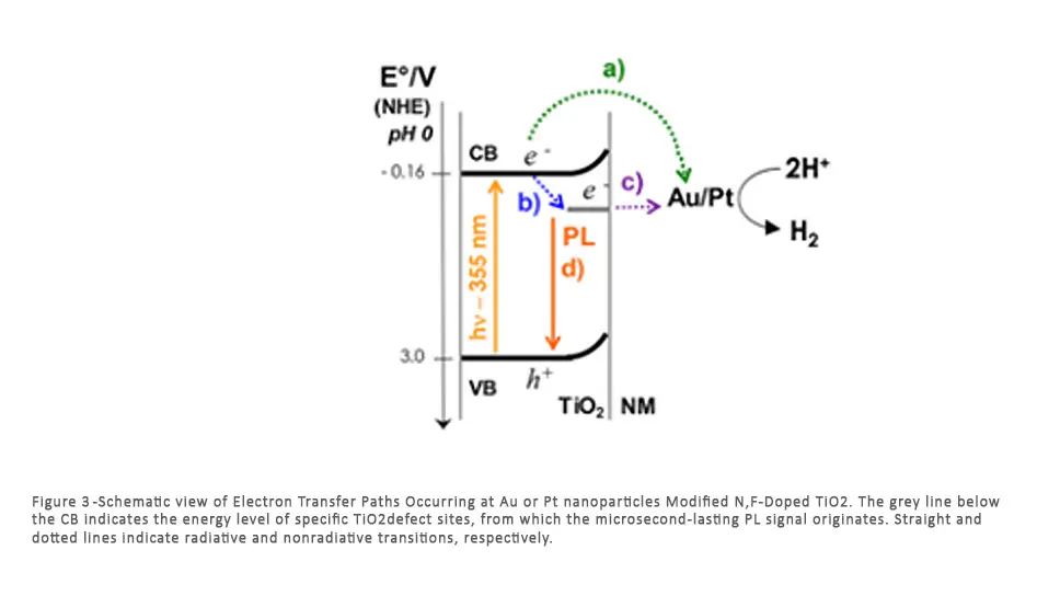 - The study of the photoactivity of titanium dioxide co-doped with nitrogen and fluorine and with noble metals nanoparticles photodeposited at TiO2 surface. We demonstrated that, while TiO2 doping with fluorine and nitrogen introduces new stabilized luminescent defective trap states below the conduction band, the presence of noble metal nanoparticles induces a PL intensity suppression, which is ascribed to the formation of new efficient electron transfer paths from luminescent defective trap states, where proton reduction occurs (Figure 3).