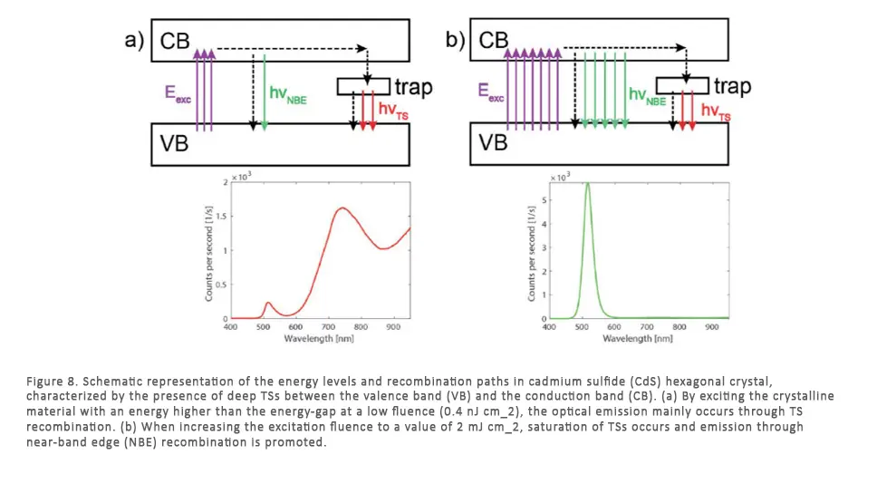 - Photoluminescence spectroscopy at variable excitation fluence: Following excitation, crystalline solids exhibit different radiative and non-radiative recombination pathways that are informative of the energetic structure of the material and of the presence of crystal defects and impurities. To probe these different recombination paths, we use PL spectroscopy at variable excitation fluence to force a non-linear photophysical response of the system. In particular, high fluence induce the saturation of metastable levels and promotes the emission from other radiative and non-radiative pathways (Figure 8). The method is particularly effective for studying the recombination channels in semiconductor materials.
