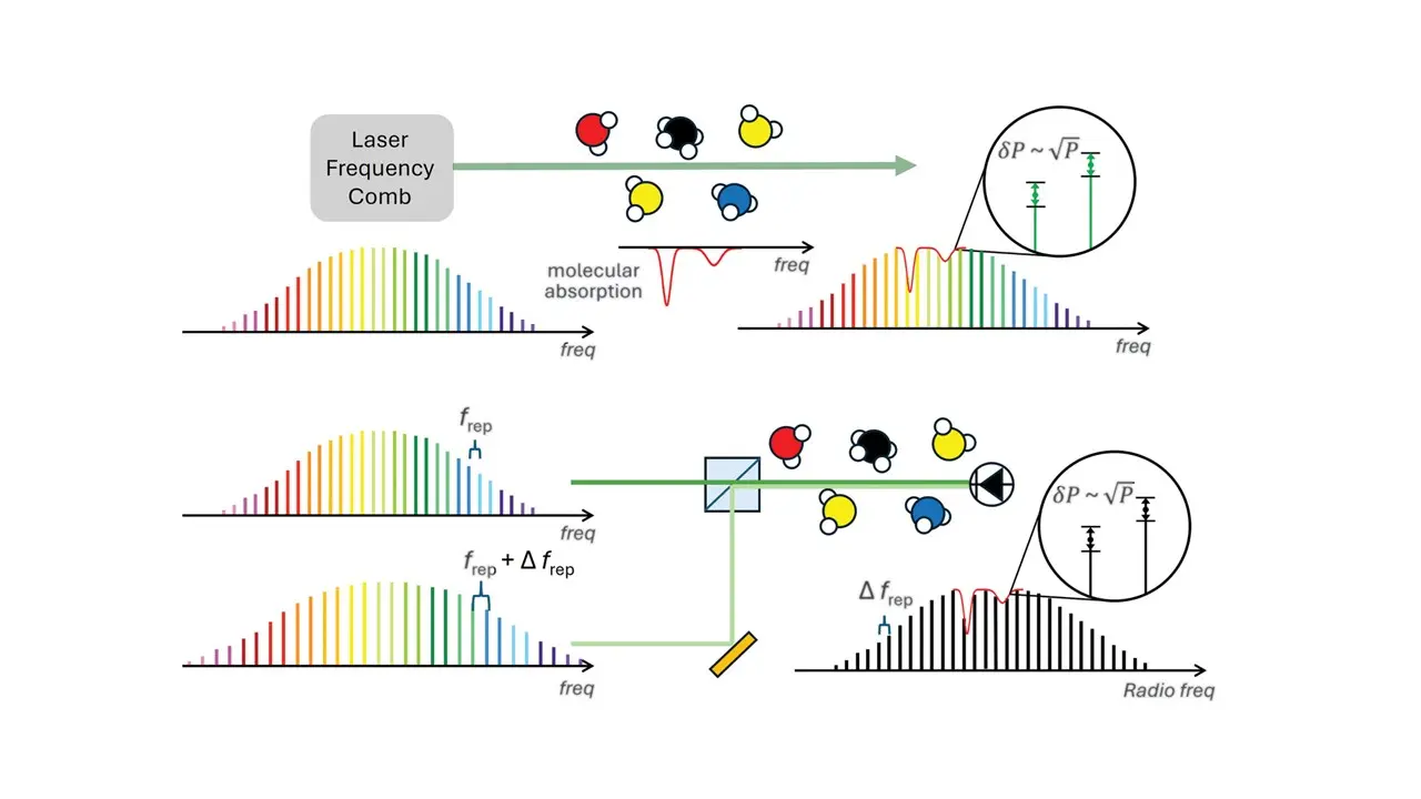 L’approccio adottato per il rilevamento di gas in tracce si basa sulla spettroscopia dual-comb (DCS), una tecnica spettroscopica avanzata che consente di rilevare simultaneamente numerose specie molecolari all’interno di un campione gassoso, con elevatissima sensibilità e alta risoluzione temporale e spettrale. Questa metodologia è particolarmente vantaggiosa per applicazioni quali: i) l’identificazione di biomarcatori nel respiro umano, ii) il monitoraggio di processi industriali, iii) lo studio della chimica della combustione, iv) la misurazione degli inquinanti atmosferici. Il punto di forza della DCS risiede nell’uso di due pettini di frequenza ottici: uno agisce come sonda del profilo di assorbimento del campione, mentre l’altro fornisce una griglia di frequenze equidistanti di riferimento. Questo consente un’acquisizione parallela dello spettro di assorbimento su migliaia di righe spettrali, migliorando notevolmente velocità e dettaglio chimico.