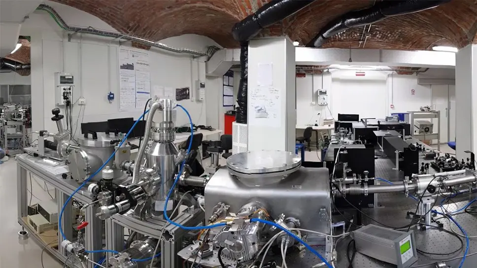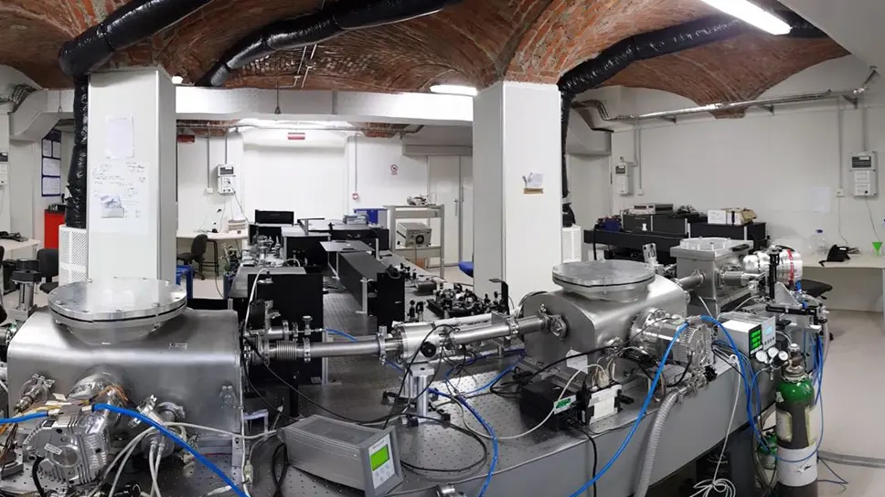 La sorgente laser è costituita da un sistema amplificato a Ti:zaffiro, che genera impulsi da 35 fs, con un'energia di 6 mJ e frequenza di ripetizione di 1 kHz. Una frazione del fascio laser in uscita dall’amplificatore (energia per impulso di 1.2 mJ) viene poi inviata in un compressore a fibra cava per la generazione di impulsi con durate fino a 5 fs ed energia di circa 0.8 mJ. La restante porzione del fascio è utilizzata per la generazione di impulsi nella regione spettrale dell’ultravioletto mediante processi nonlineari.