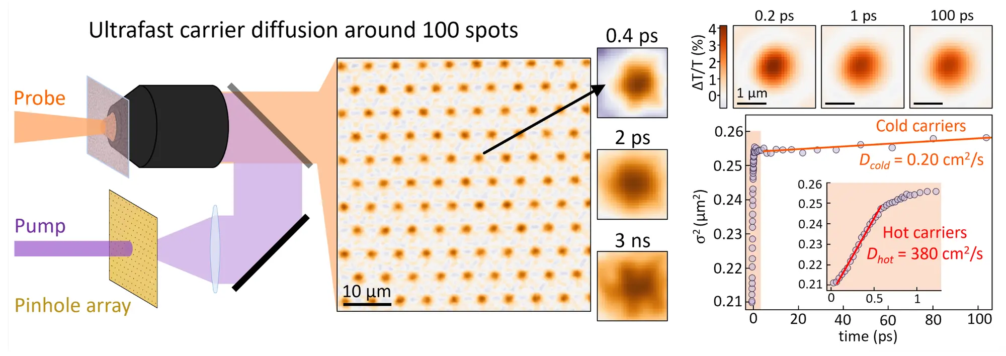 In this Master’s thesis, the student will learn and apply an innovative technique developed in our lab to study hot-carrier transport in tin-based halide perovskites in collaboration with the group of Maria Antonietta Loi (University of Groningen, Netherlands). The technique used is ultrafast holographic microscopy, a novel concept that enables ultrafast imaging of large sample areas simultaneously. Standard femtosecond microscopes image carrier diffusion around a single diffraction-limited excitation spot, lacking any ability to address sample heterogeneities and needing tedious sequences of measurements of different spots to acquire statistics. Thanks to the new holographic approach, we are able to study carrier diffusion around 100 diffraction limited spots in a single measurement, vastly outperforming standard techniques. The student will perform experiments to characterize the carrier diffusion in tin-based perovskites and analyze the data to extract the diffusion parameters.
