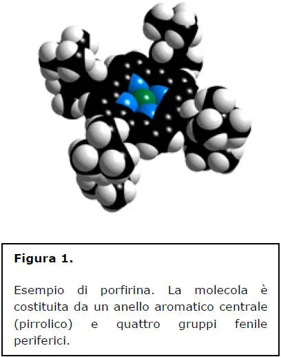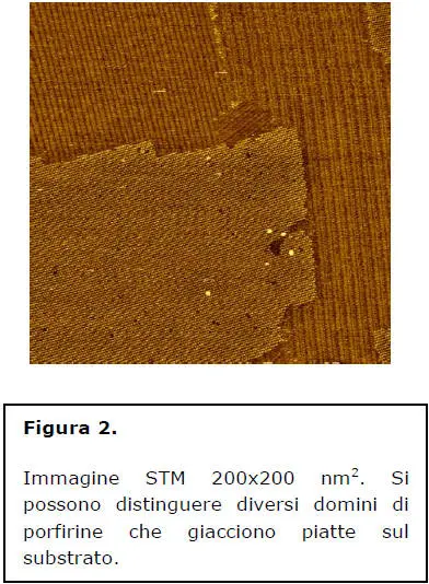 A titolo di esempio, riportiamo una ricerca condotta nel nostro laboratorio STM su alcune molecole organiche chiamate porfirine (si veda la figura 1), di notevole interesse in fisica e chimica, perché presenti in natura ad esempio nella clorofilla e nel gruppo eme del sangue. Queste molecole sono oggi considerate preziose nel campo dell’elettronica organica per le loro particolari caratteristiche chimico-fisiche. Nonostante ciò, le proprietà di aggregazione molecolare su diversi substrati conduttivi possono compromettere la stabilità delle porfirine e, conseguentemente, il loro effettivo uso nei dispositivi elettronici. Il microscopio STM permette di indagare il comportamento locale delle molecole cresciute su substrato(si veda la figura 2) e quindi di trovare le migliori condizioni di stabilità molecolare sulla superficie.