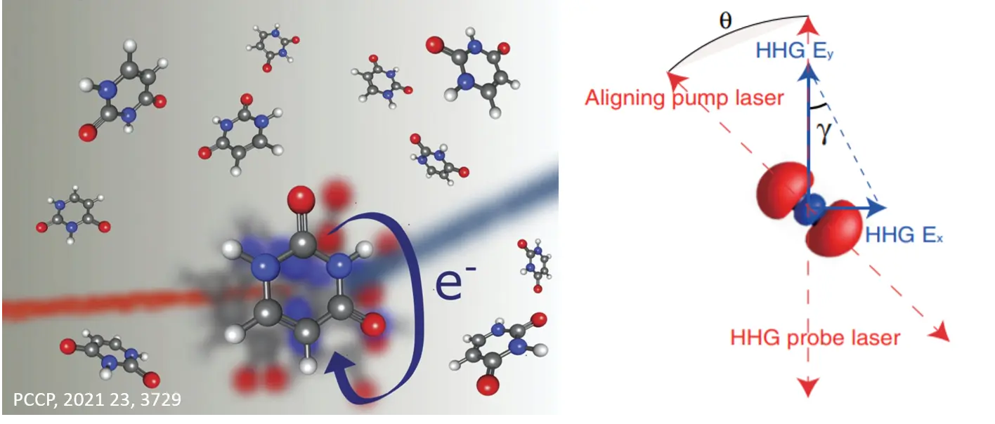 This thesis project aims at the retrieval of the outermost orbital structure in molecules in the ground state or undergoing optical or vibrational excitation through the acquisition of high-order harmonic spectra driven by intense laser pulses, combined with the detection of the polarization state of such harmonics. The study targets molecules of biological relevance, starting from simple systems (acetylene, ethylene, butadiene,…) and scaling the approach to more complex molecules, such as chiral systems (fenchone, camphor, iodo-butane,…).