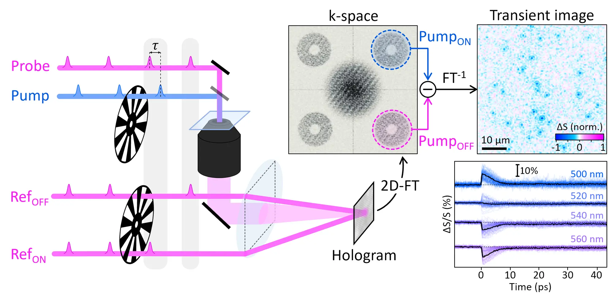 Femtosecond pump-probe spectroscopy is a key tool to reveal incredibly accurate details about the ultrafast dynamics in various physical systems, with applications ranging from biology to material science. However, spatial information is completely missing in standard ultrafast spectroscopy, preventing a complete characterization of the system under study. Ultrafast microscopy provides the sub-micron spatial resolution needed to study material’s heterogeneity and spatially dependent transient phenomena. However, megapixel cameras are incapable of acquiring every single shot of the laser, resulting in an acquisition that is highly affected by the laser intensity fluctuations. For this reason, current pump-probe microscopes use single-pixel detectors and raster scanning of the sample or cameras with very few pixels, thus limiting the observations to very small 2D areas.
